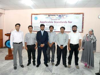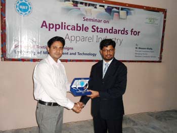School of Textile and Design organized seminar on Applicable Standard for Apparel Industry. M. Waseem Khaliq, Principal Compliance Agent Managing Partner, presented lecture on applicable standards that are being developed for apparel industry. These included social compliance standards, quality management system, ISO 9001, technical assessment by different EU, US based customers, custom trade partnership against terrorism, product safety certification, OEKO TEX certification, global organic textile standard, REACH and RSTS.