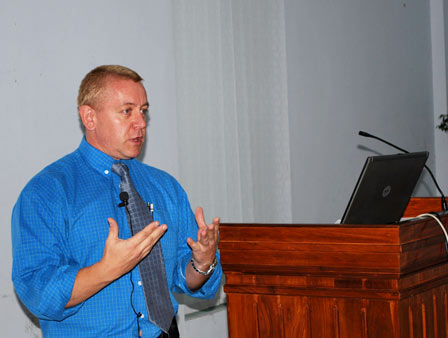 Thomas has 30 years of experience in dyeing and processing. He gave an overview on the global dye house situation and discussed the robotics used in the industry with a series of machines like Thies Yarn Dyeing Machine, Thies Fabric Dyeing Machine, Ecomasin, Luft Roto Plus SII, Heat Recovery Equipment, Plant Automation and Colormatic. A wide range of information and books were also offered to the textile students.