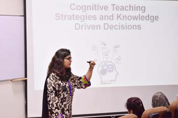 Ms Arooj Ahmmed Quraushi from one of the recognized private education system, a senior and certified trainer motivated, versatile administrator, highly qualified responsible for: technology integration, software analysis and review, and examinations of more than 100 primary and secondary schools all across Pakistan. She demonstrated an interesting and interactive session on cognitive teaching skills and assessment strategies. She demonstrated how teachers can facilitate quality teaching and learning by applying cognitive teaching strategies and addressing higher order learning requirements.