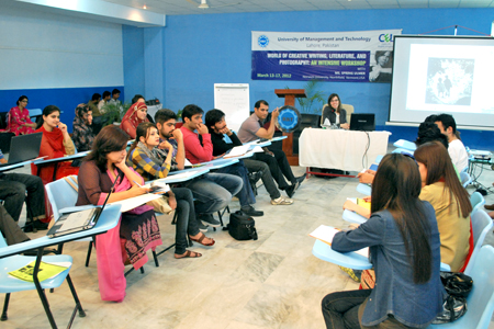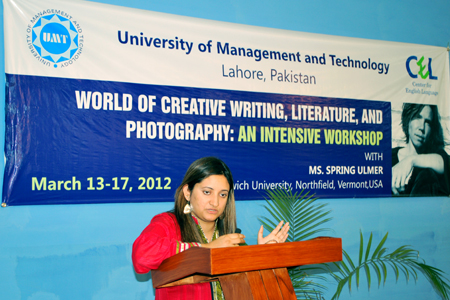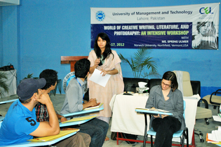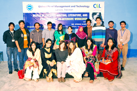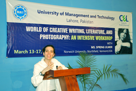 The Center for English Language (CEL) at UMT organized a five-day series of rigorous workshop in fine-arts, literature and pedagogy. The training entitled, “World of Creative Writing, Literature, and Photography: An Intensive Workshop”, was conducted by a scholarly figure, Spring Ulmer, of Norwich University, Northfield, Vermont USA. Ulmer’s teaching and research competencies include African Literature; Composition and Rhetoric; Contemporary Art Issues; Cultural Studies; Feminism; Genocide: Literature and Theory; Journalism; Justice Studies; Creative Nonfiction; Poetics; Photography; Post-colonial Literature and Theory; World Literature.